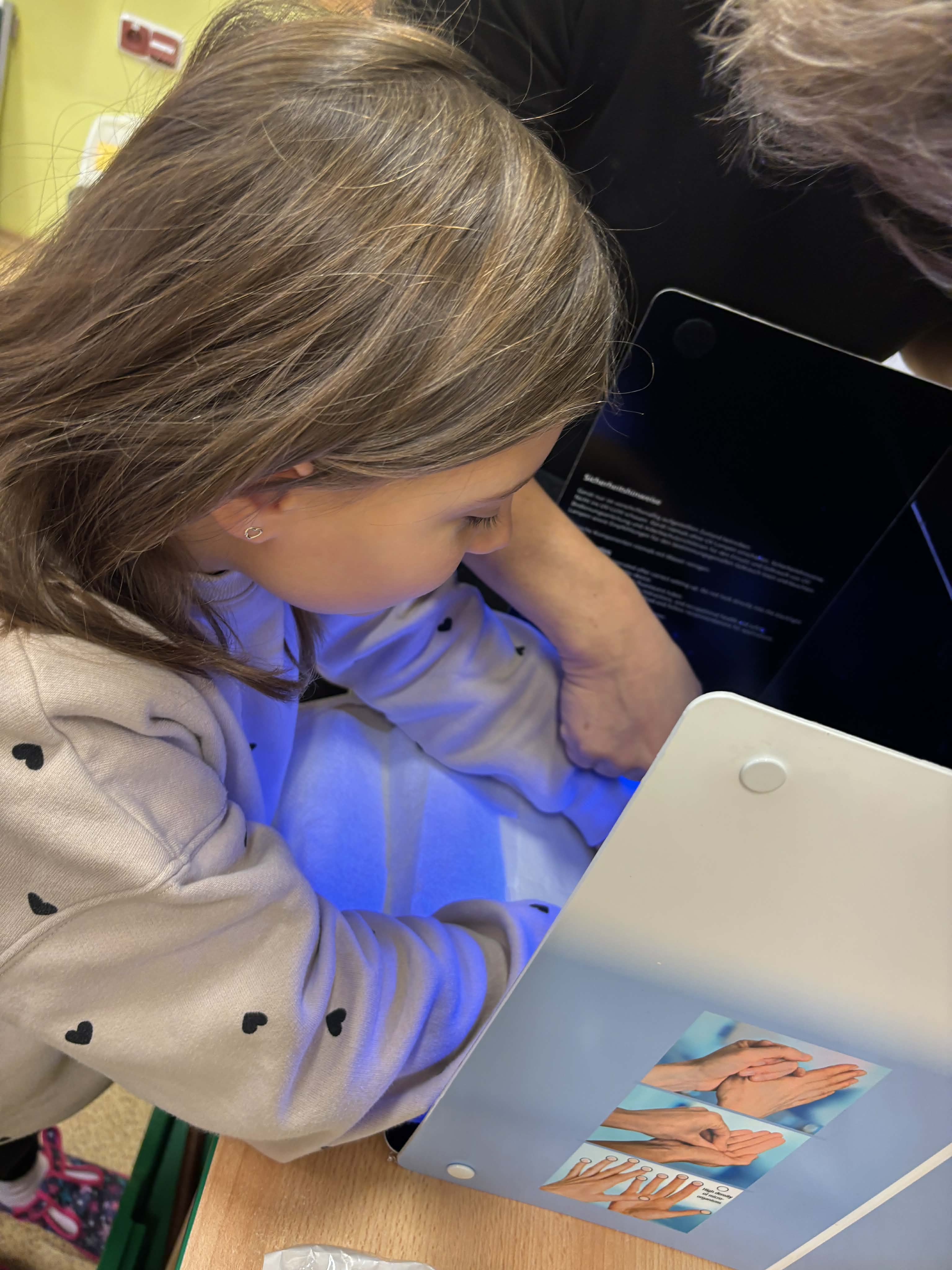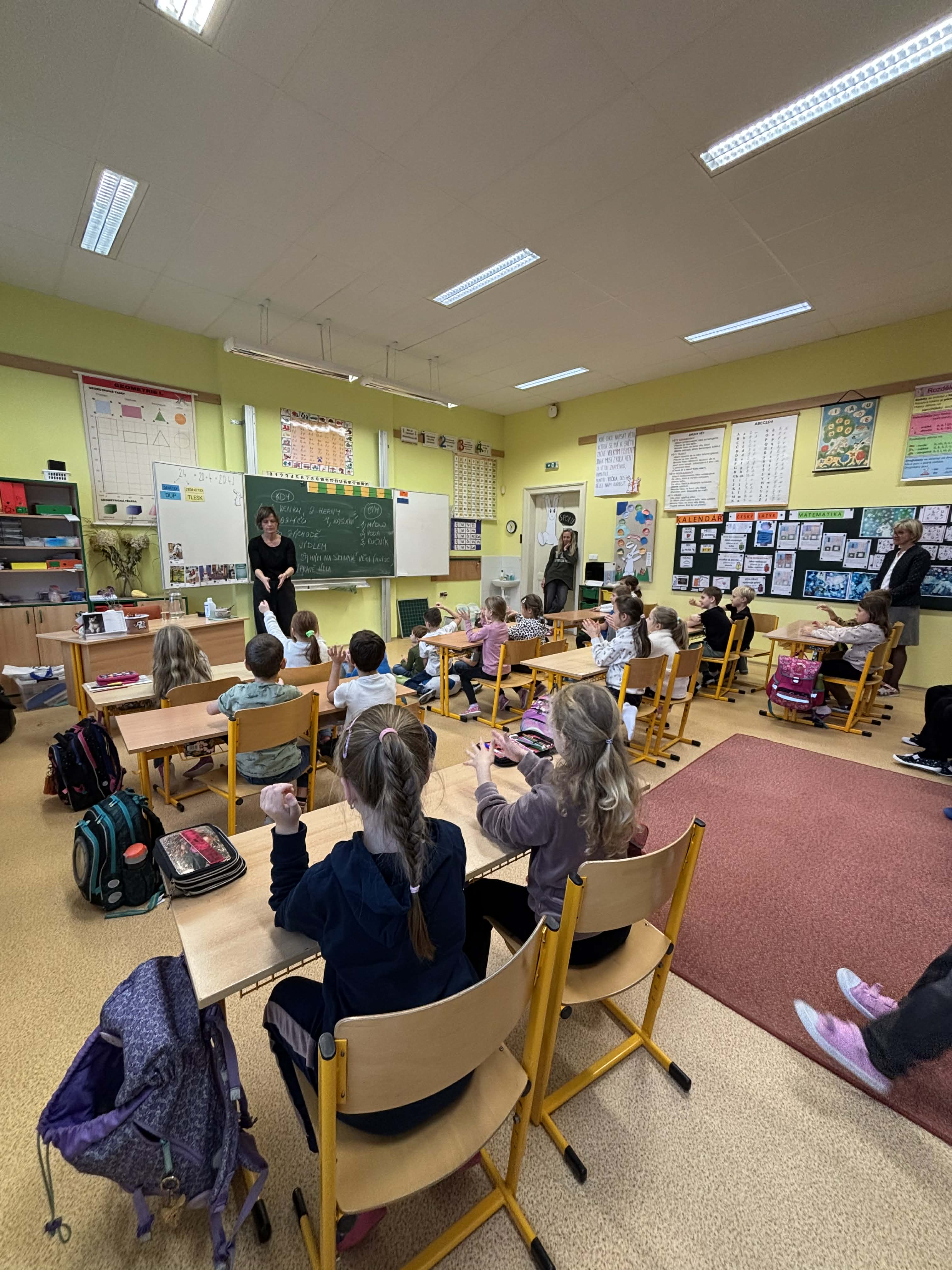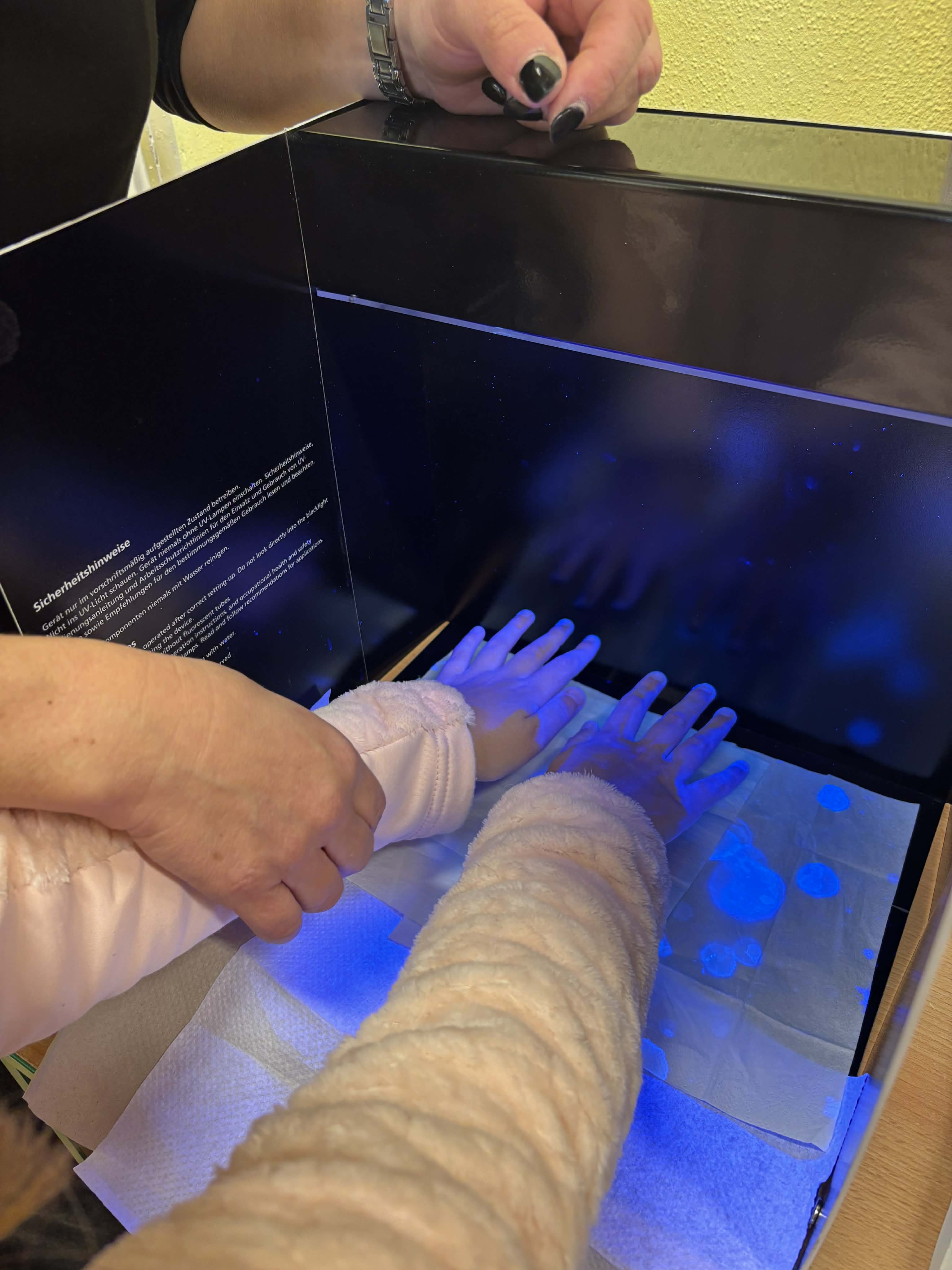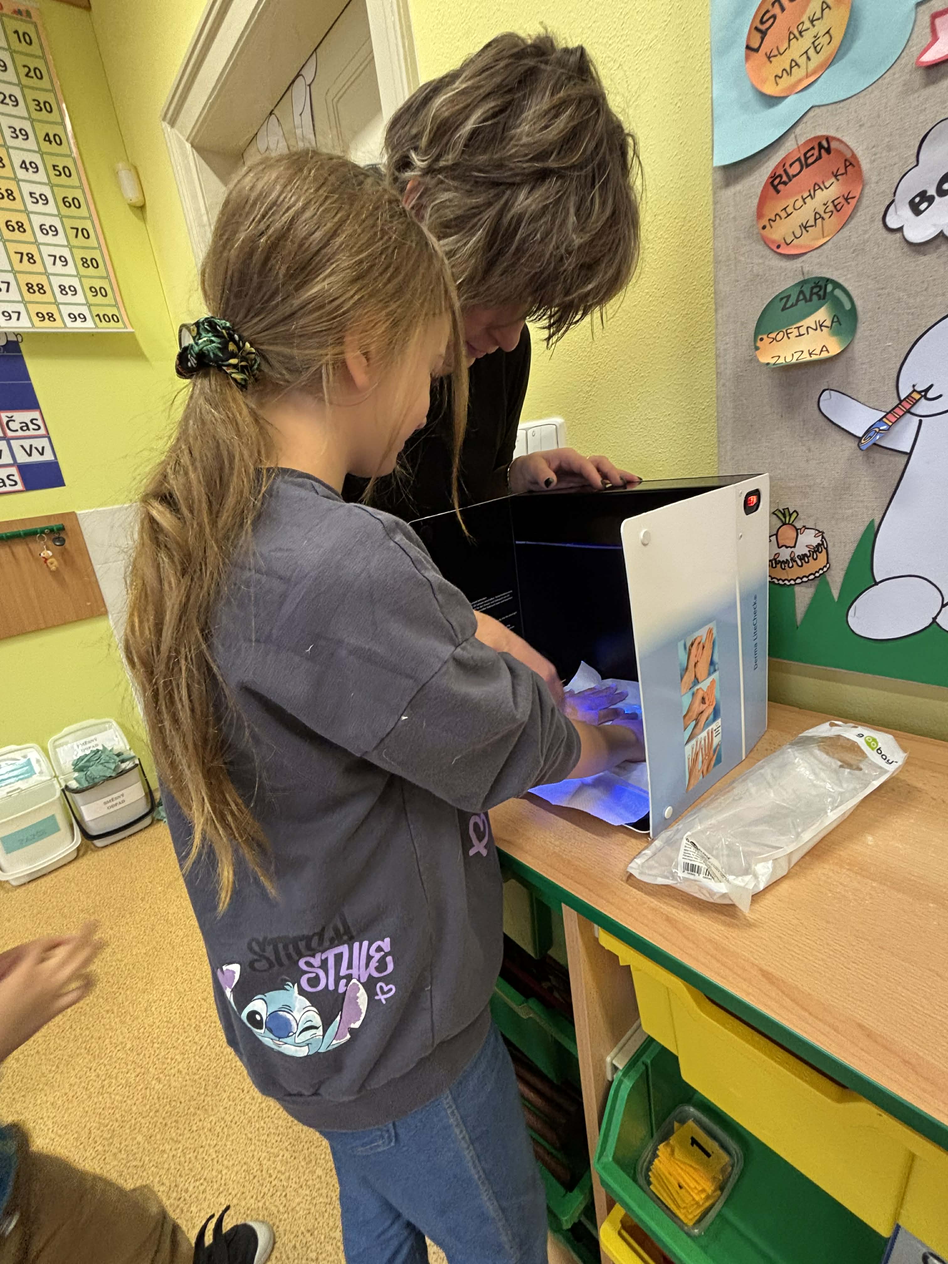 V pátek 21.11. navštívila naši školu paní z hygieny, která dětem ukázala, jak si správně mýt ruce. Dětem také vysvětlila, proč je mytí rukou důležité. Poté následovala názorná ukázka mytí rukou a jednoduchý pokus o bakteriích a mýdle. Na závěr děti vložily ruce do kouzelné krabičky. Ta pod světlem ukázala, jak pečlivě byly ruce umyté.